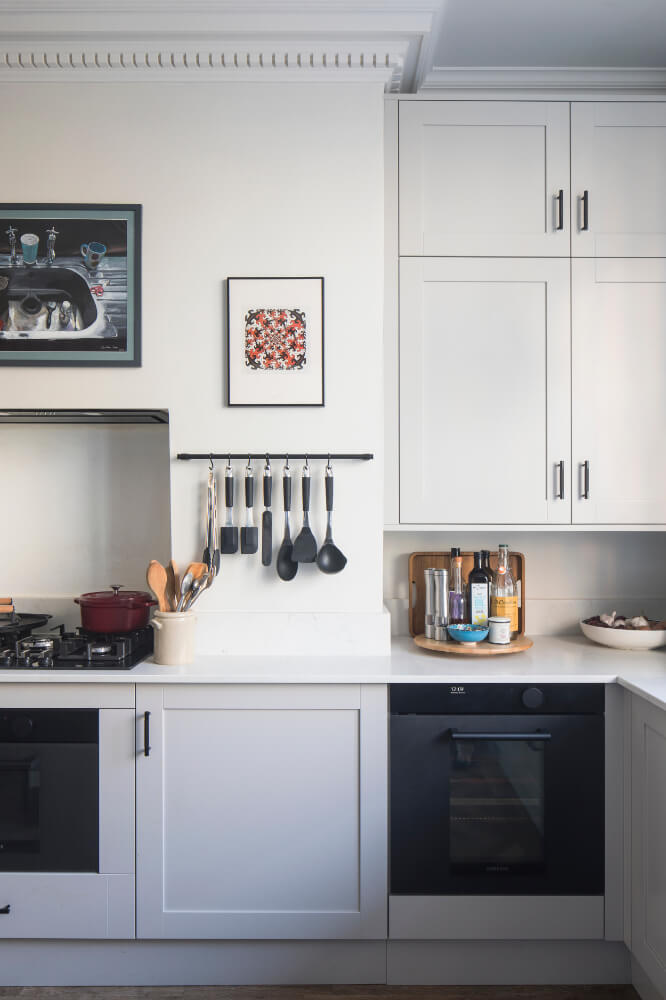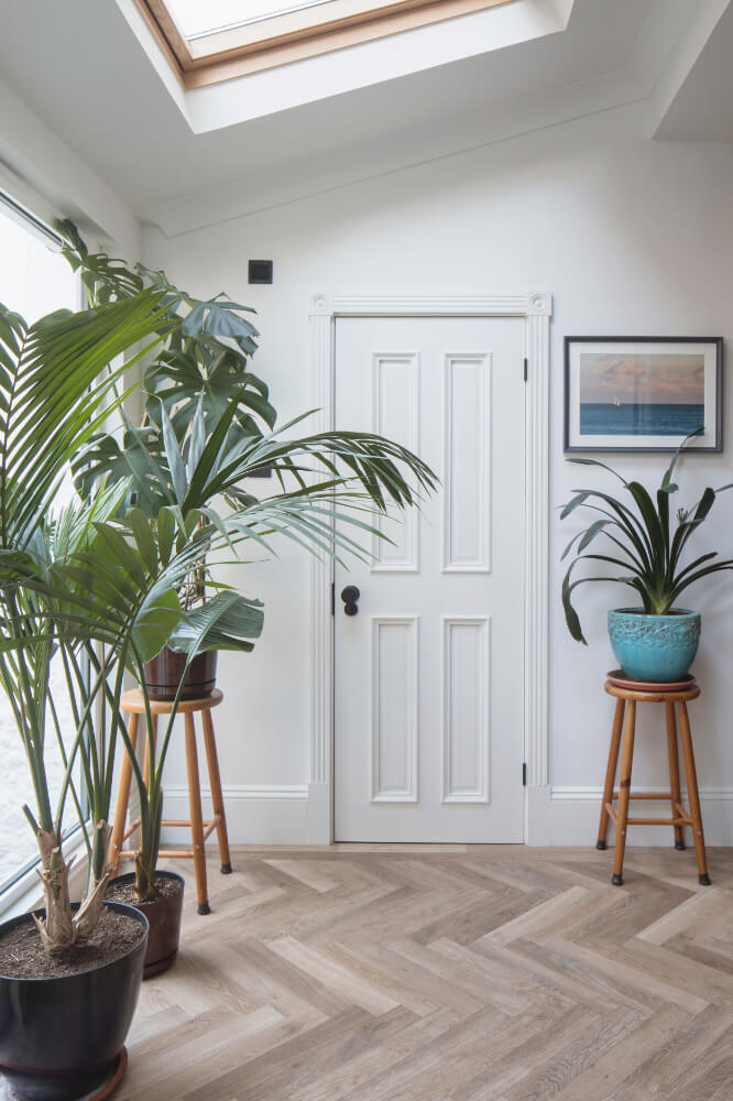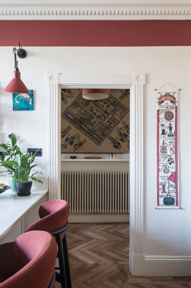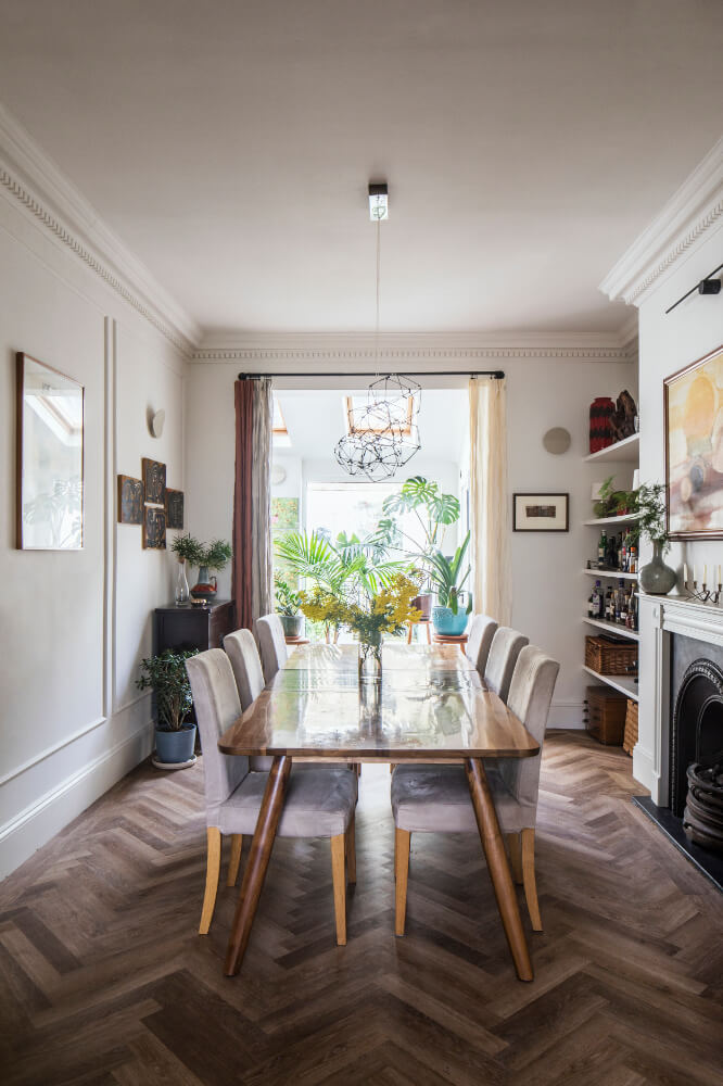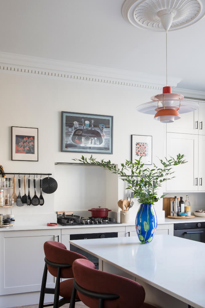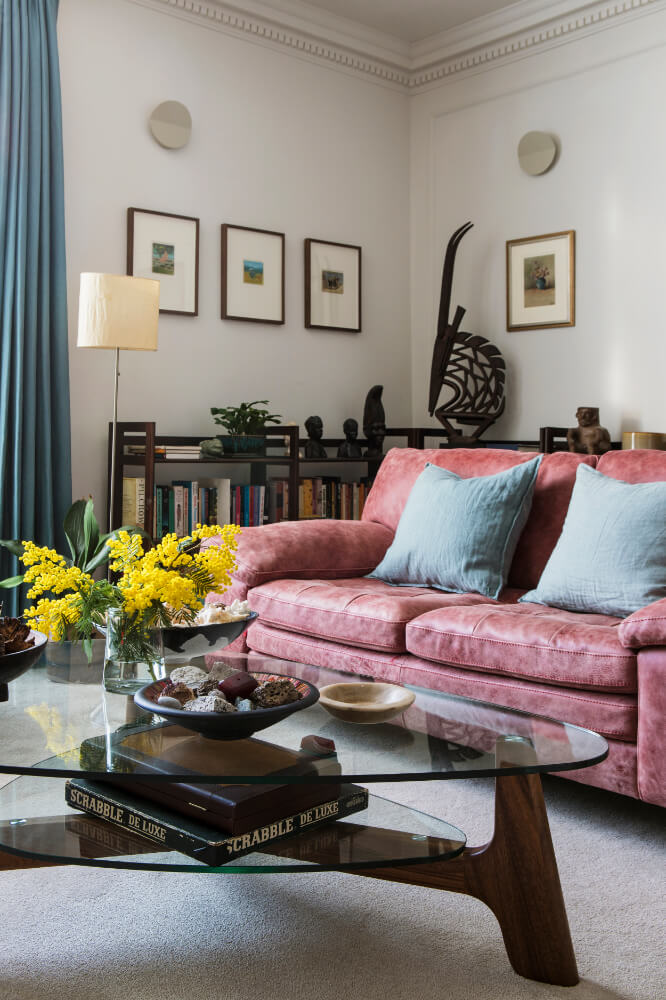 The clients are keen cooks who love hosting, and the interiors reflect their personalities and influences — including African heritage, a love of art and collecting, and an appreciation for mid-century design. Original-style panel detailing was reinstated to add texture and depth to the walls, creating a considered backdrop for the clients’ art collection and houseplants.